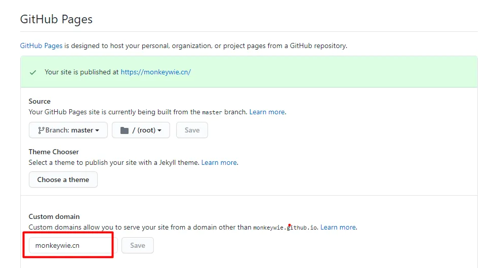 然后 github 会自动签发提供给monkeywie.cn域名使用的 SSL 证书,等待一段时间后,就可以通过HTTPS访问博客了。