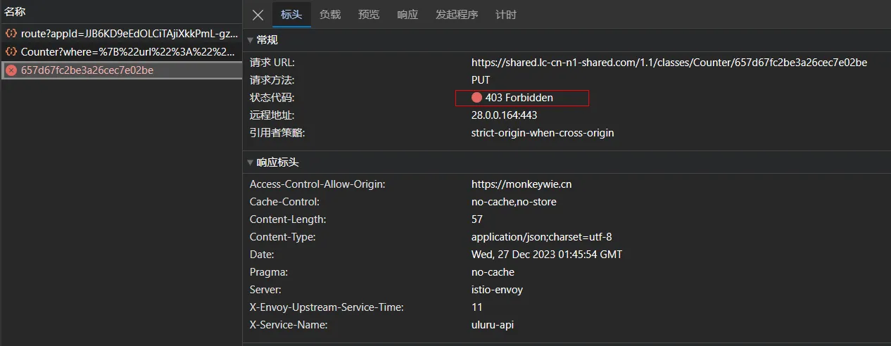 Next 中内置的leancloud_visitors插件是用leancloud的存储功能来实现的,类似一个mongodb,不知道什么时候开始默认把权限变成了只读,所以每次更新统计数的时候都会报403权限问题,通过网络请求可以看到: