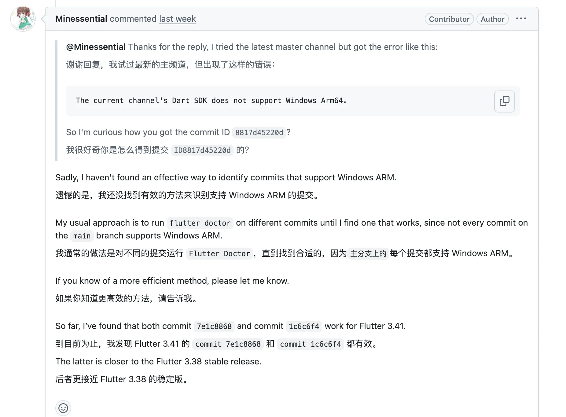 The current channel's Dart SDK does not support Windows Arm64.框架代码可能声称支持了,但对应的 Dart SDK 二进制还没编译出来。只能一个个 commit 试,跑flutter doctor,不行就换下一个。