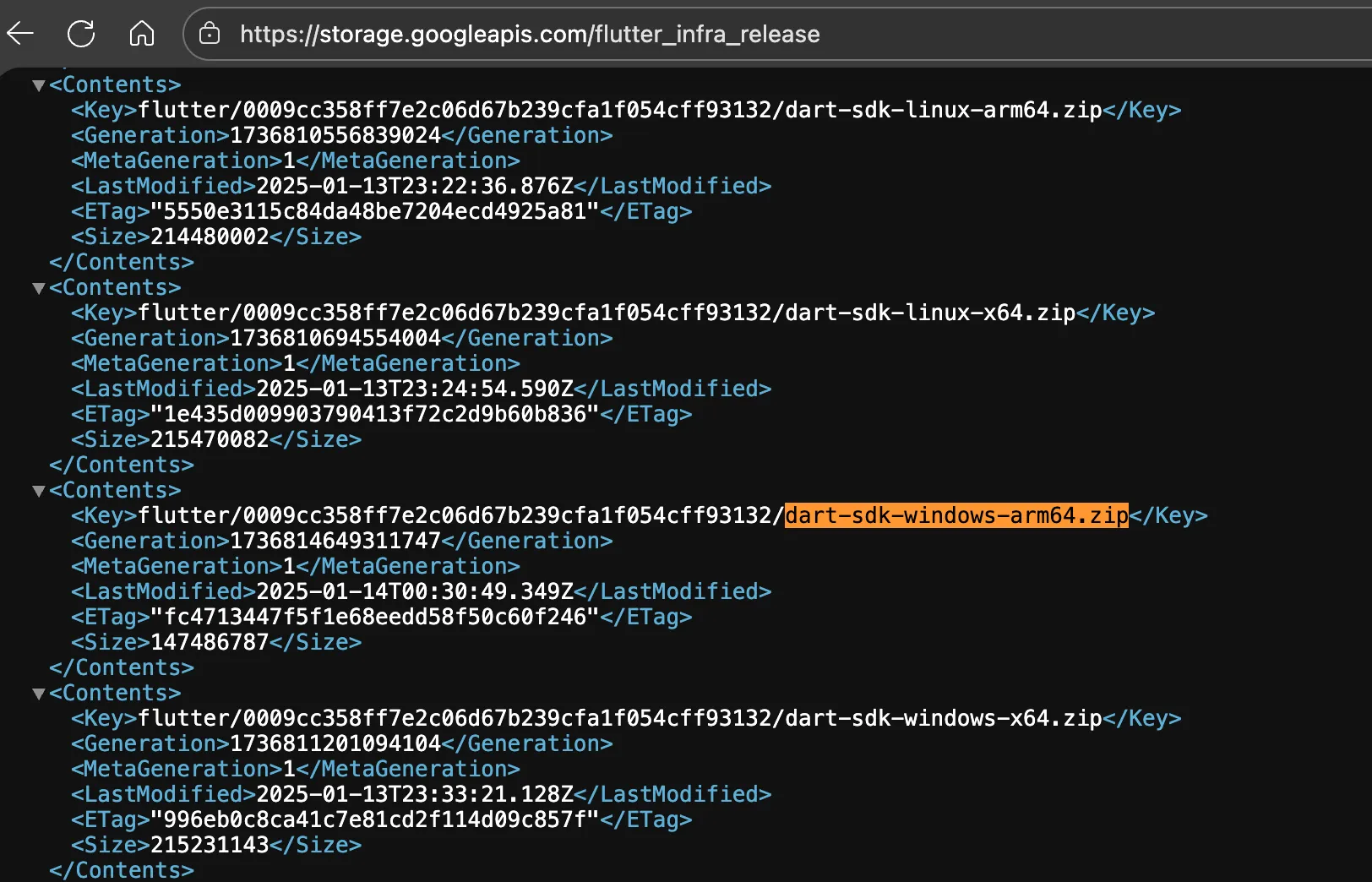 https://storage.googleapis.com/flutter_infra_release打开是个巨大的 XML 索引文件,搜索dart-sdk-windows-arm64.zip关键词: