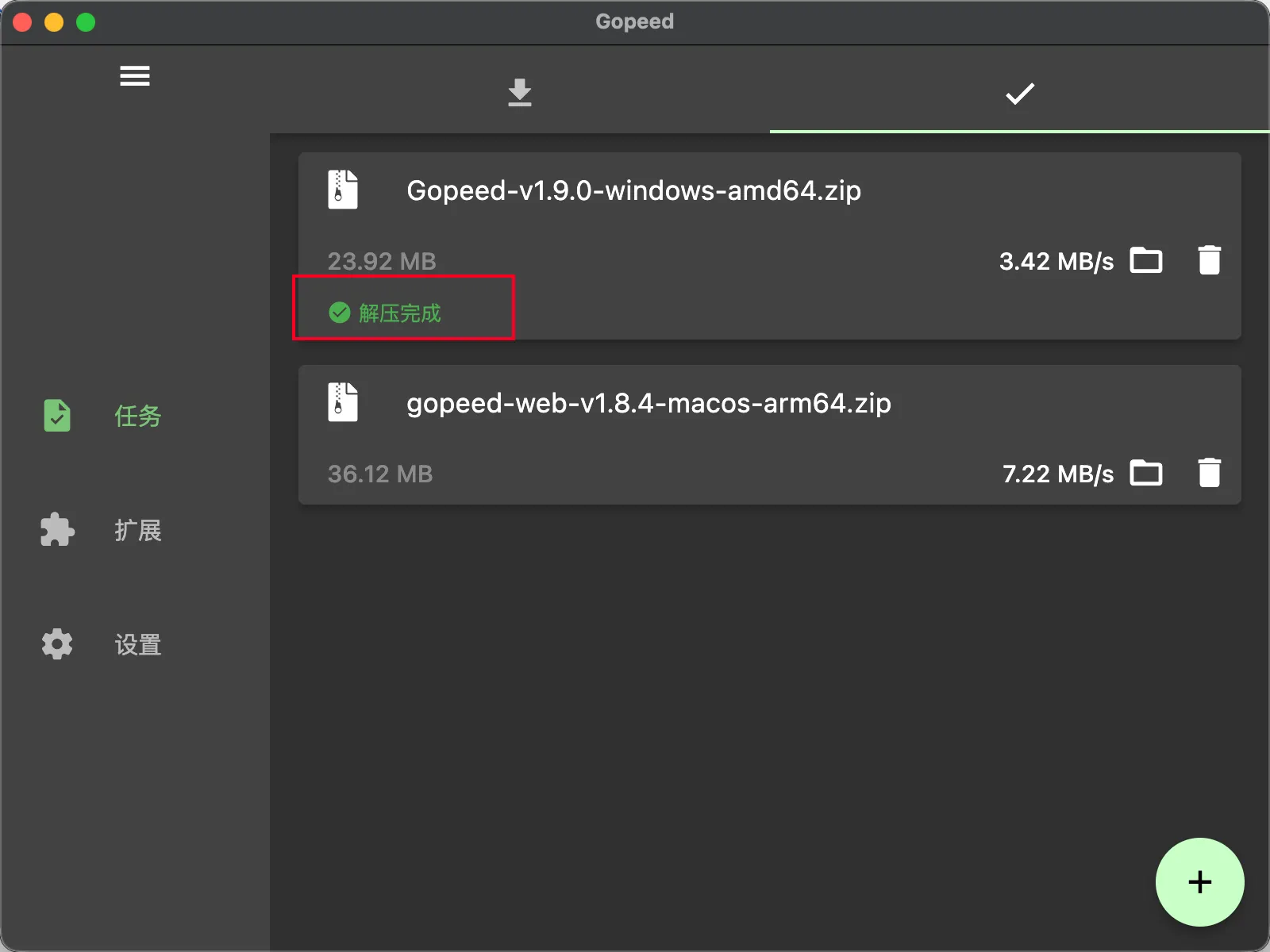 任务完成后会自动开始解压,状态可以在 UI 上看到: