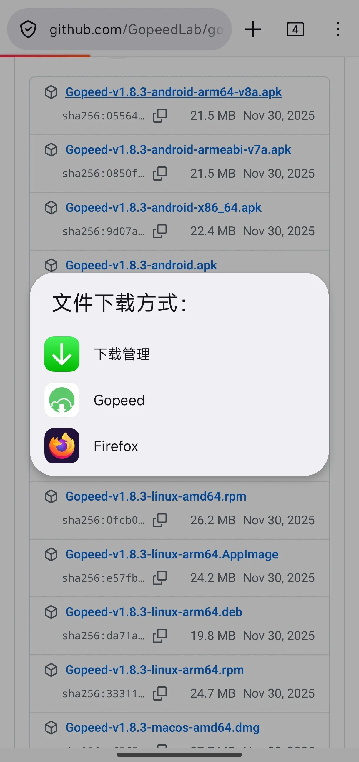 现在在安卓端用浏览器下载文件时,如果浏览器支持第三方下载器(比如 Firefox),就能选 Gopeed 了:
