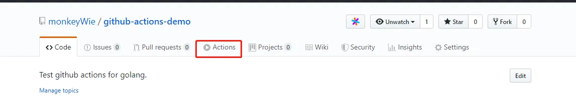接着创建一个Github仓库,我测试的仓库地址是https://github.com/monkeyWie/github-actions-demo,项目用 go 语言写的,代码非常简单就是两个 hello world 级别的代码,里面包含了普通的 go 程序和 cgo 程序。