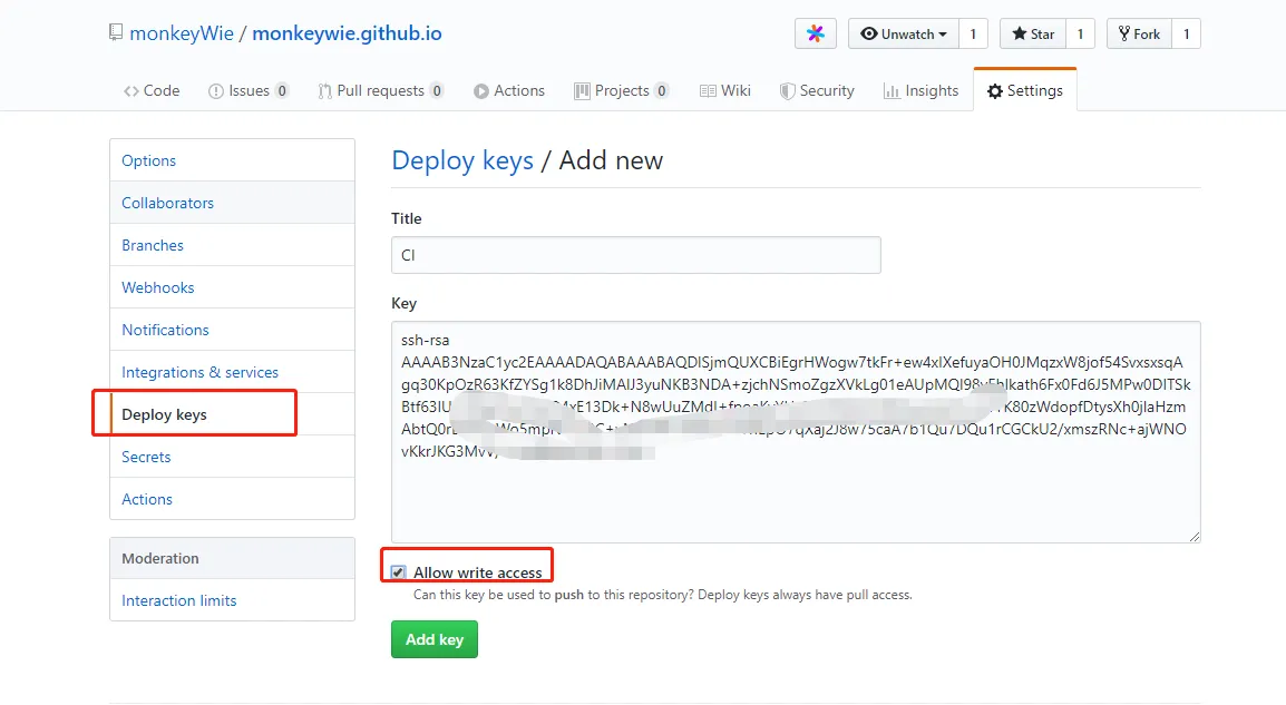 ssh-keygenGenerating public/private rsa key pair.Enter file in which to save the key (/root/.ssh/id_rsa):Created directory '/root/.ssh'.Enter passphrase (empty for no passphrase):Enter same passphrase again:Your identification has been saved in /root/.ssh/id_rsa.Your public key has been saved in /root/.ssh/id_rsa.pub.The key fingerprint is:SHA256:XG1vkchp5b27tteZASx6ZrPRtTayGYmacRdjjRxR1Y0 root@8fe85d51123bThe key's randomart image is:+---[RSA 2048]----+| .+o=|| o *Eoo|| . X B .|| . . + X +.|| S . = O..|| o O B =.|| O = *.*|| o . o ++|| .oo|+----[SHA256]-----+先把~/.ssh/id_rsa.pub中的公钥添加到 Github 对应仓库的Deploye keys中: