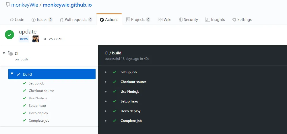 首先第一个想到能用到Github Actions的就是我的博客了,项目托管在https://github.com/monkeyWie/monkeywie.github.io,目前项目有两个分支,master分支用于存放 hexo 编译之后的静态文件,另一个hexo分支用于存放 hexo 项目环境和 markdown 文章,master分支通过Github Page配置之后可以通过monkeywie.github.io域名访问。