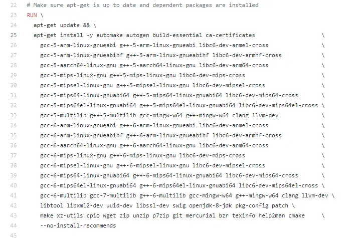 在Github Actions提供的虚拟机中,已经内置了docker,而刚好我有一个项目因为国内的网络原因构建docker镜像非常的慢,这是我fork的一个用于 go 项目交叉编译的项目,仓库地址https://github.com/monkeyWie/xgo,这个项目的主要工作原理就是通过 docker 里内置好各种交叉编译的工具链,然后对外提供 go 项目交叉编译功能,下面节选一点Dockerfile内容: