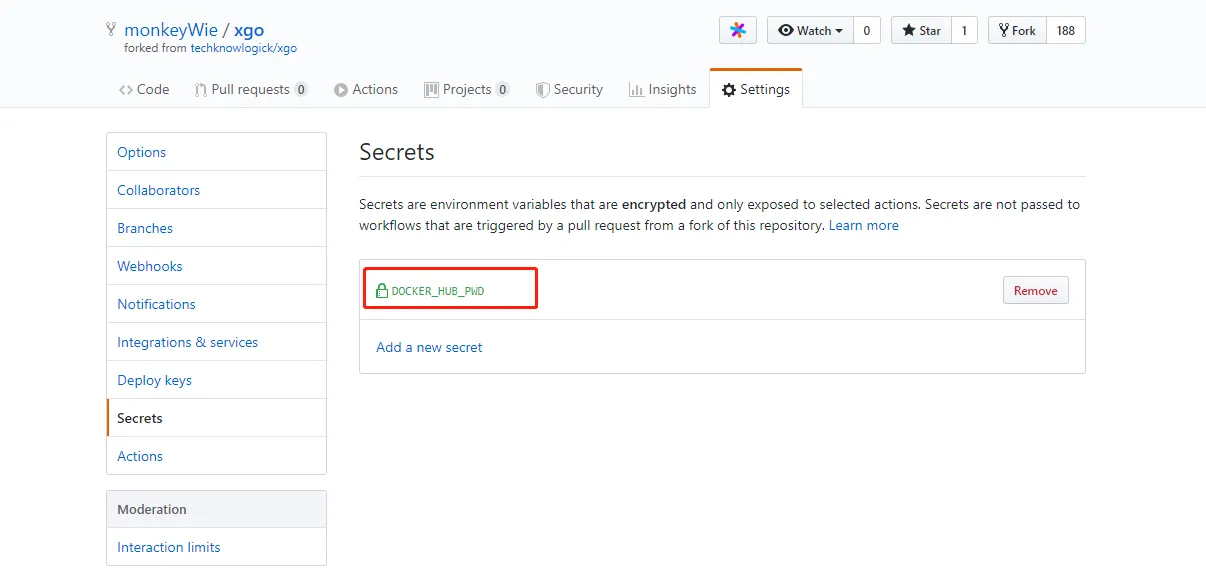 这里我把自己的用户密码配置到了Secrets中,以便在 workflow 配置文件中可以访问到: