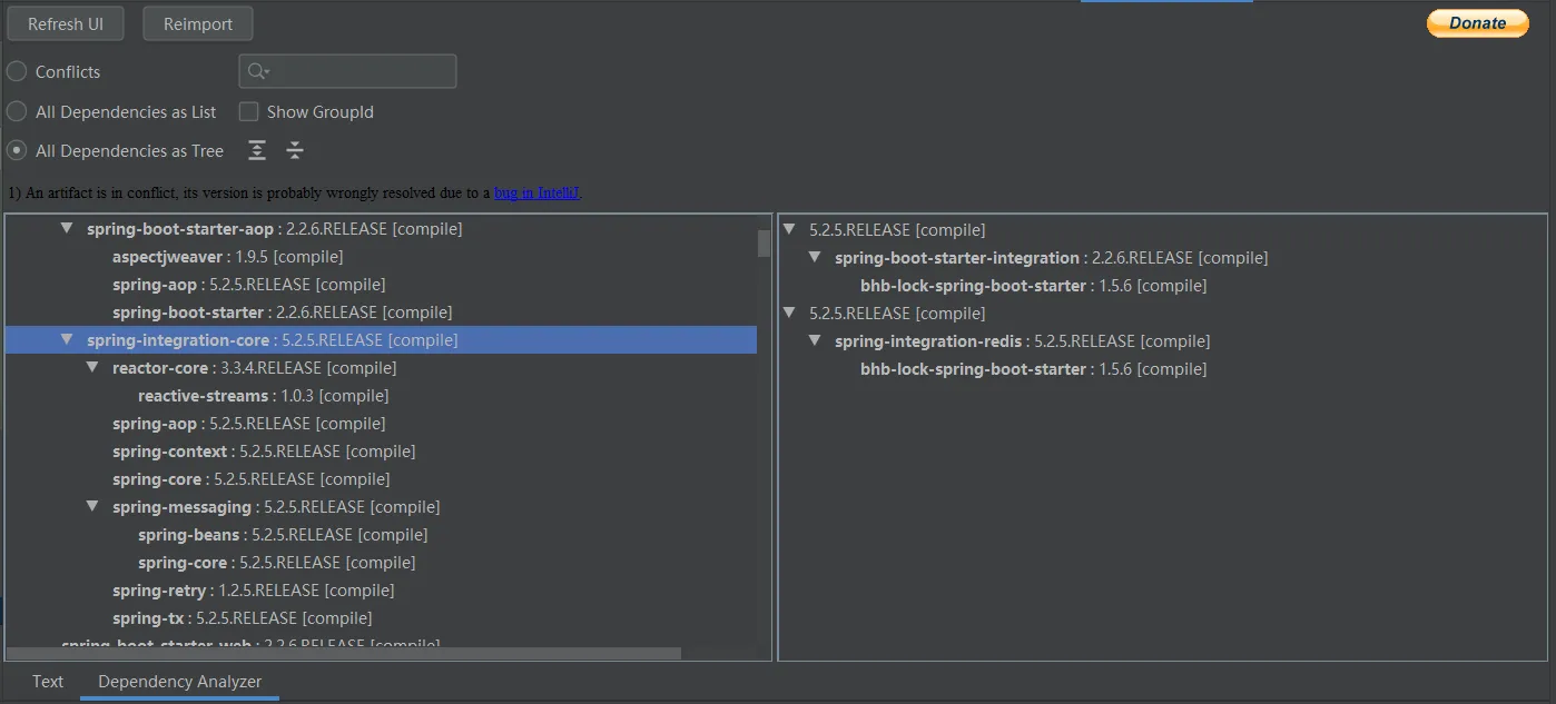 选中Conflicts插件就会列出有冲突的依赖,然后选择某个依赖就可以看到详细信息:
