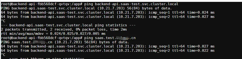 可以看到backend-api.saas-test.svc.cluster.local解析出来的 ip 是10.21.7.203,saas.test.xxx.cn解析出来的 ip 也是10.21.7.203,这样的话在集群里通过外网域名请求其实也和直接访问 service 域名一致了。