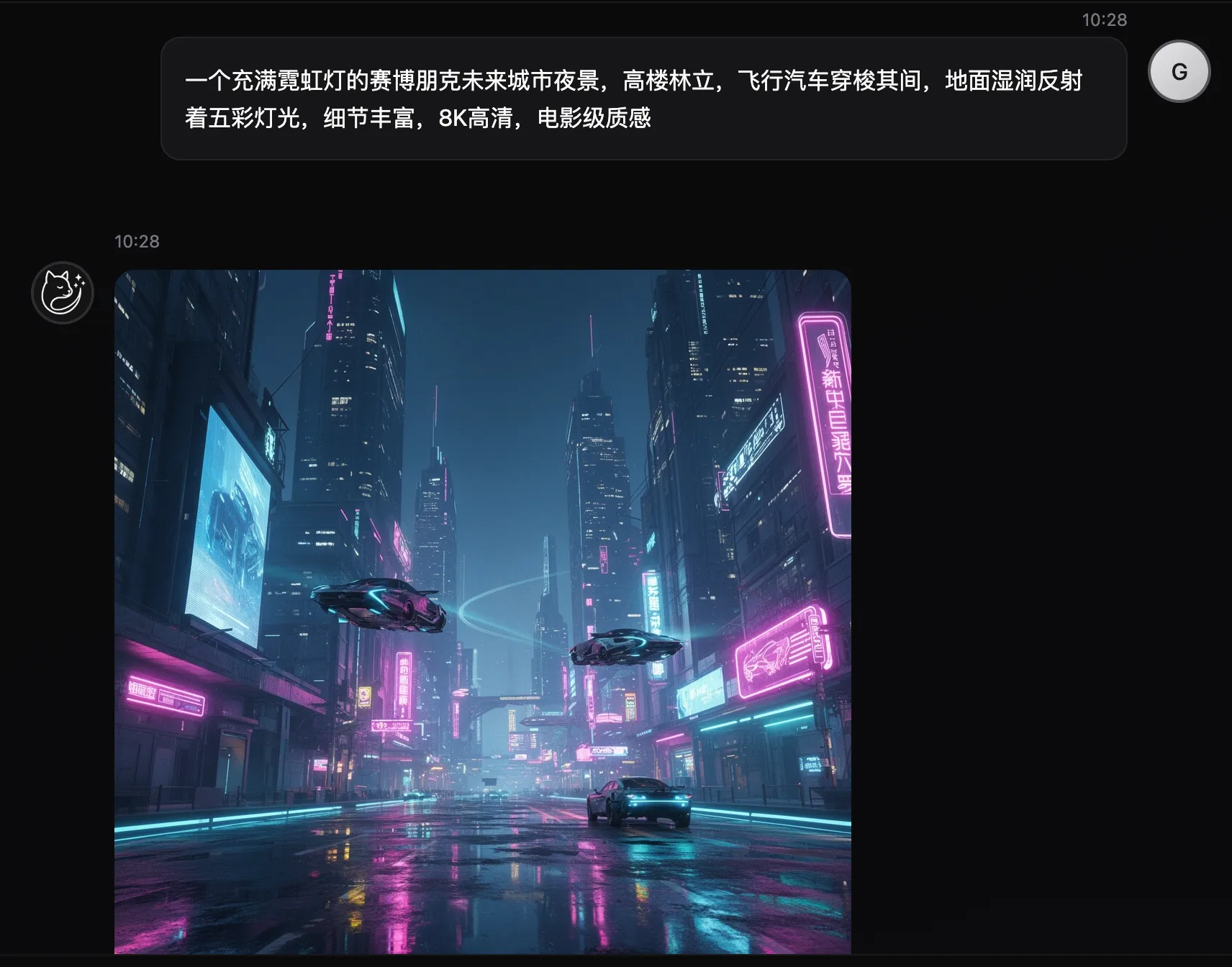 一个充满霓虹灯的赛博朋克未来城市夜景,高楼林立,飞行汽车穿梭其间,地面湿润反射着五彩灯光,细节丰富,8K高清,电影级质感