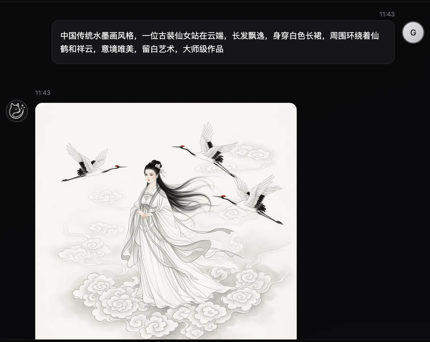 中国传统水墨画风格,一位古装仙女站在云端,长发飘逸,身穿白色长裙,周围环绕着仙鹤和祥云,意境唯美,留白艺术,大师级作品