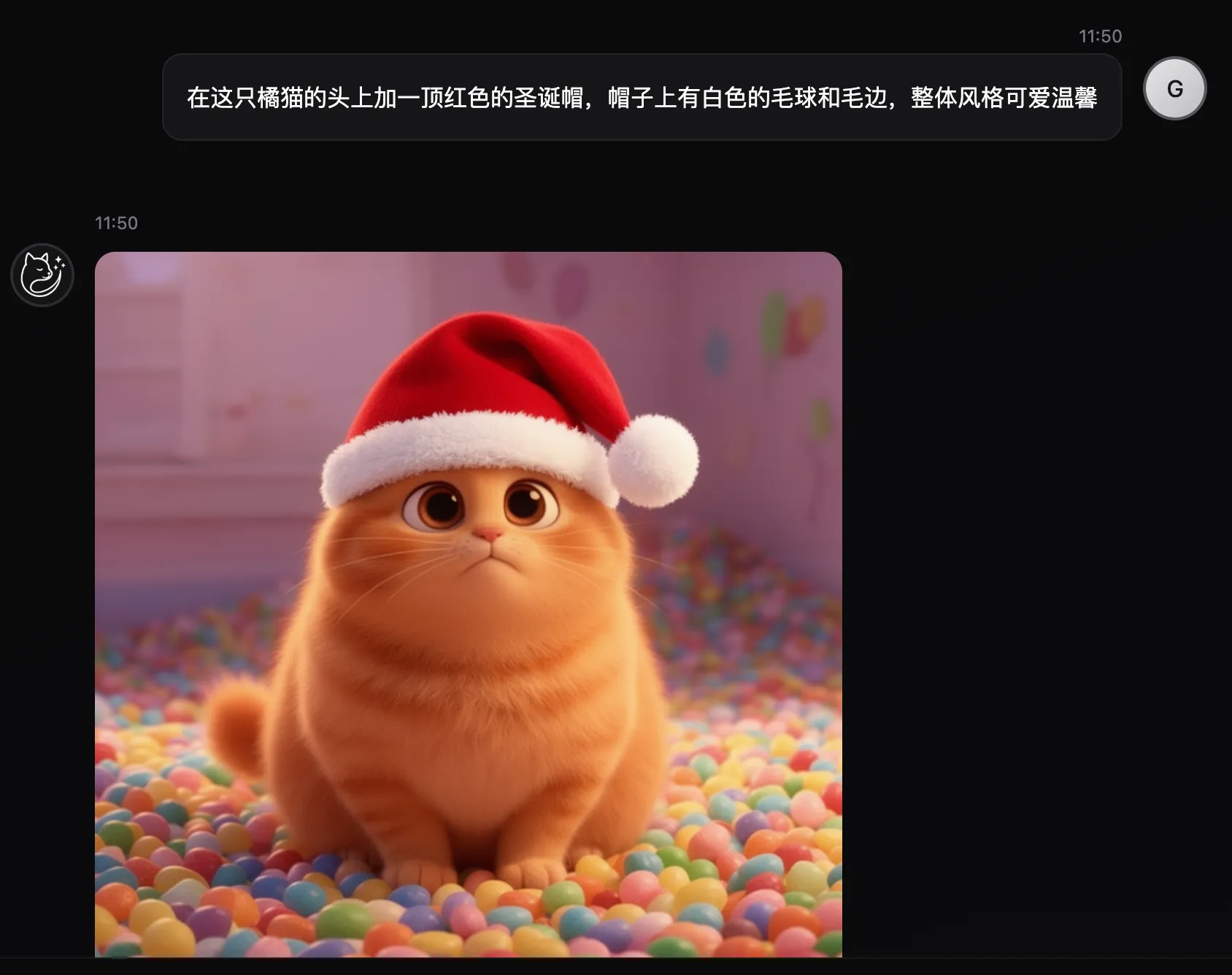 在这只橘猫的头上加一顶红色的圣诞帽,帽子上有白色的毛球和毛边,整体风格可爱温馨