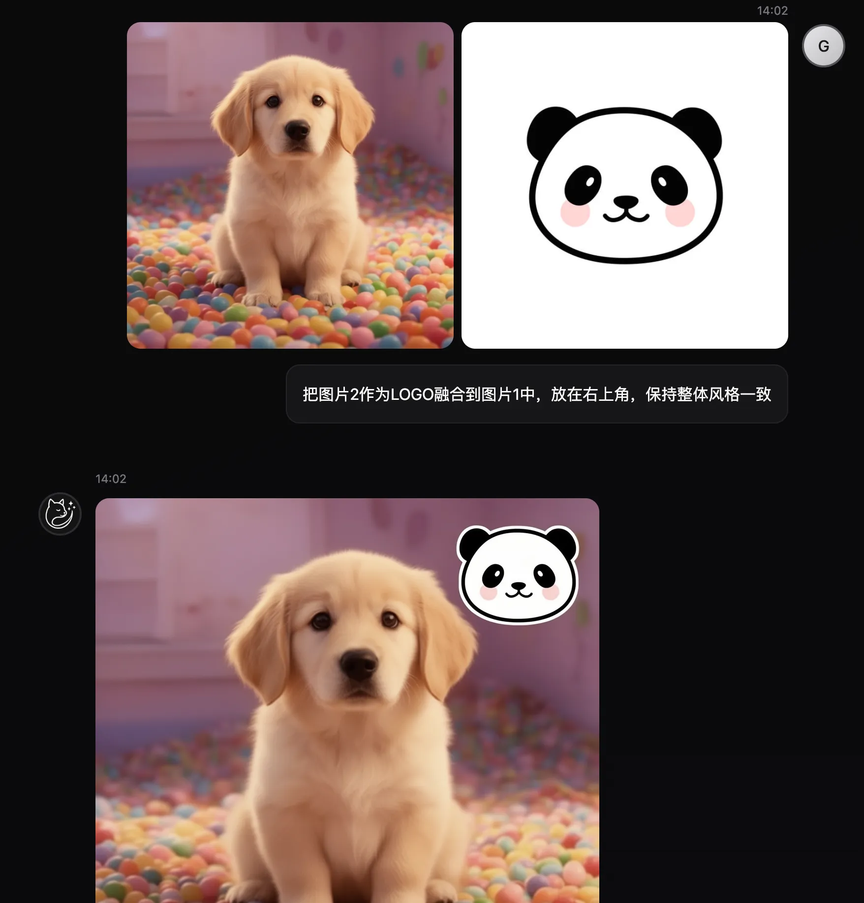 上传一个LOGO图片,然后让模型把它融合到上面的狗狗图片中: