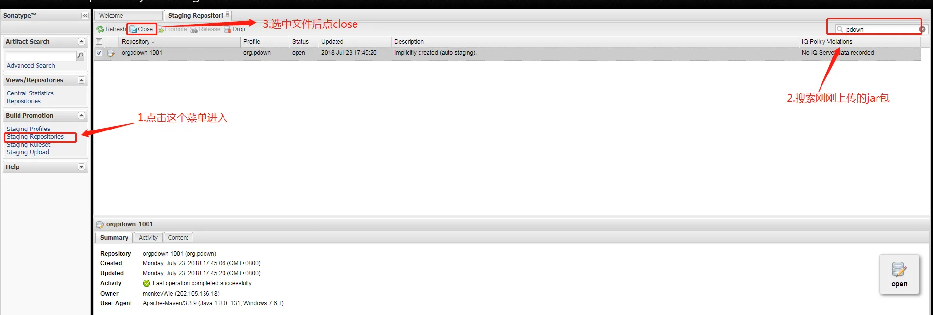 mvn clean deploy -P release -Dgpg.passphrase=YourPassphase- 如果部署成功的话使用创建 issue 的帐号登录这个网址https://oss.sonatype.org/,然后看图操作。