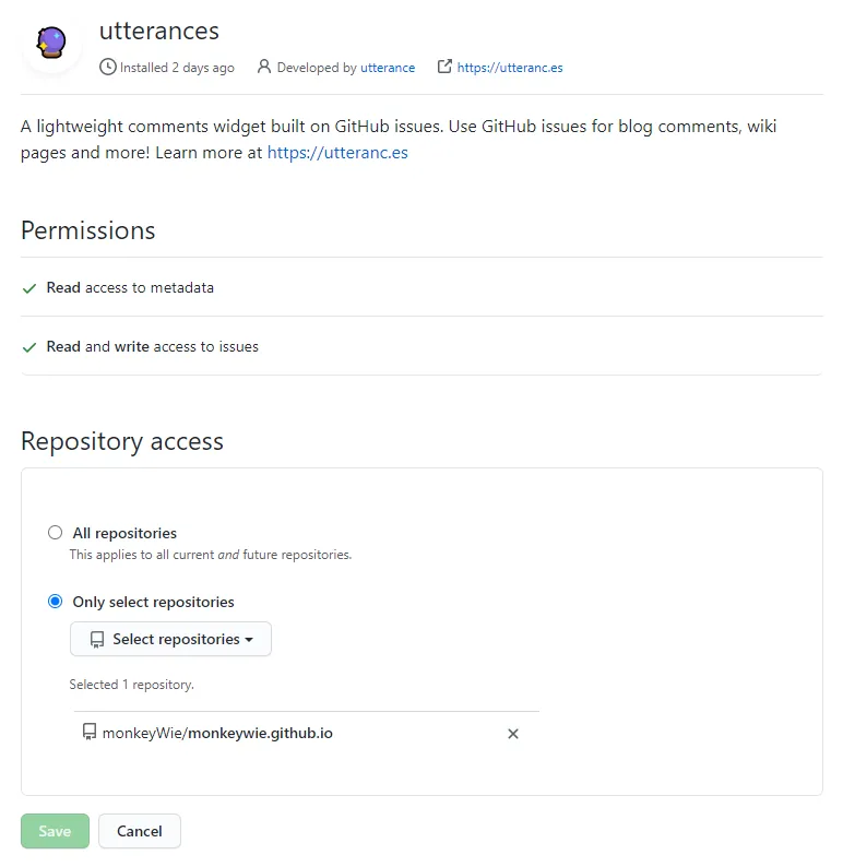 而utterances是通过Github Apps实现的,权限粒度划分的很细,可以单独对某个仓库进行授权,并且只对issues模块授权: