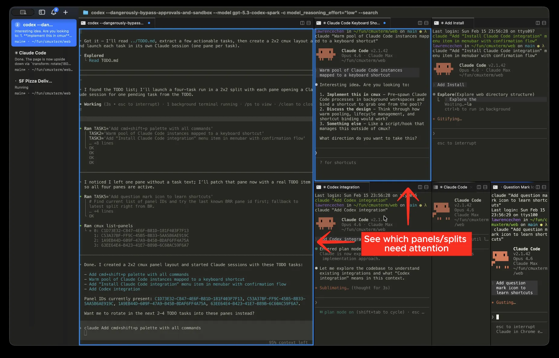 我平时并行的项目多的时候有 4 个左右,算下来就是 10 几个终端窗口同时开着。屏幕上全是杂乱无章堆叠在一起的终端,切来切去效率简直了,而且更折磨人的是 agent 等待确认这件事。agent 做到一半,遇到需要你拍板的问题,它就停在那等着。但你根本不知道它停了——没有精准的跳转,没有明显的提示,得挨个窗口翻过去检查,非常麻烦。