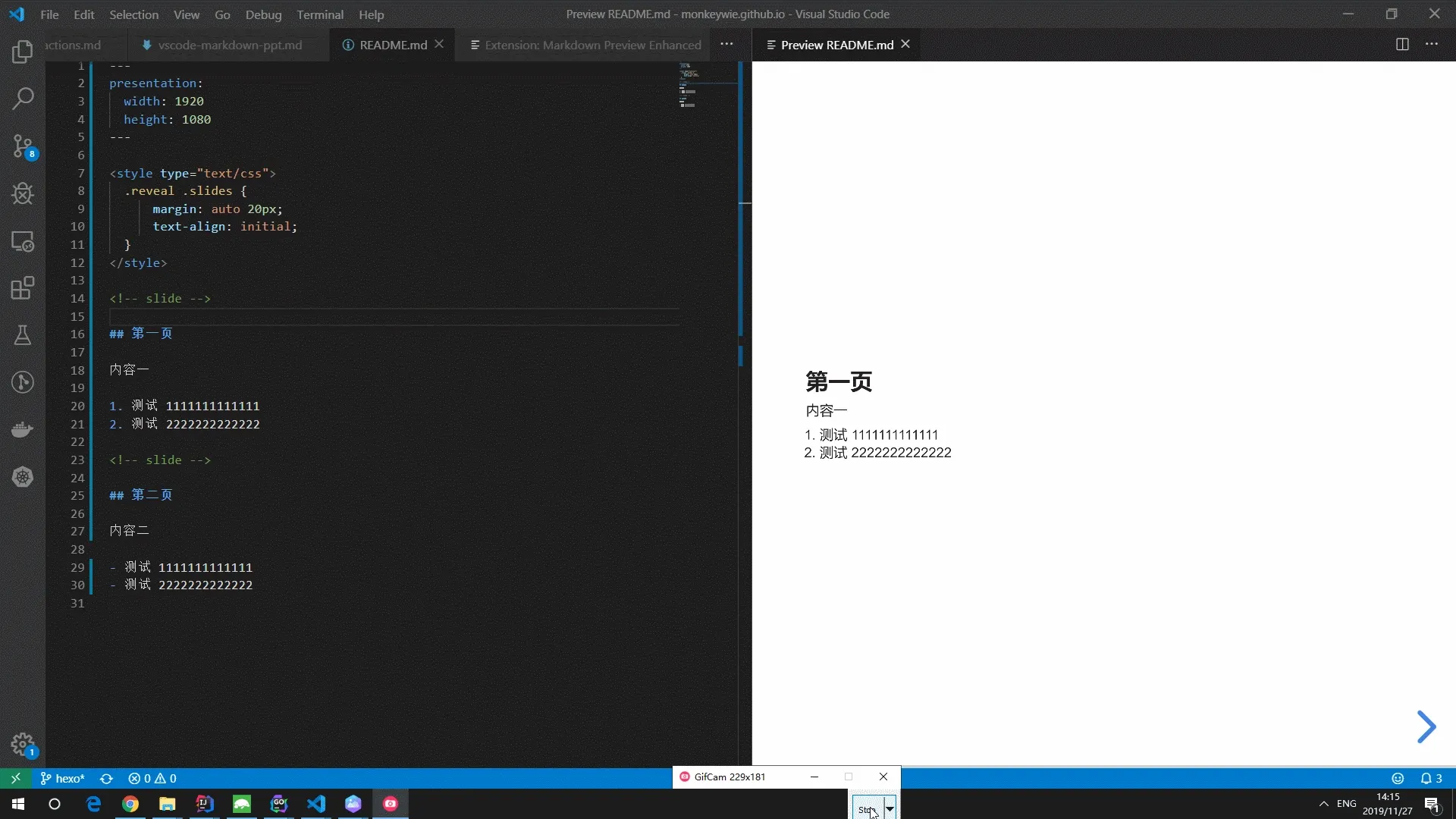 并且还附带了其它非常多的功能,比如目前所需的幻灯片功能,相关文档在这:https://shd101wyy.github.io/markdown-preview-enhanced/#/zh-cn/presentation