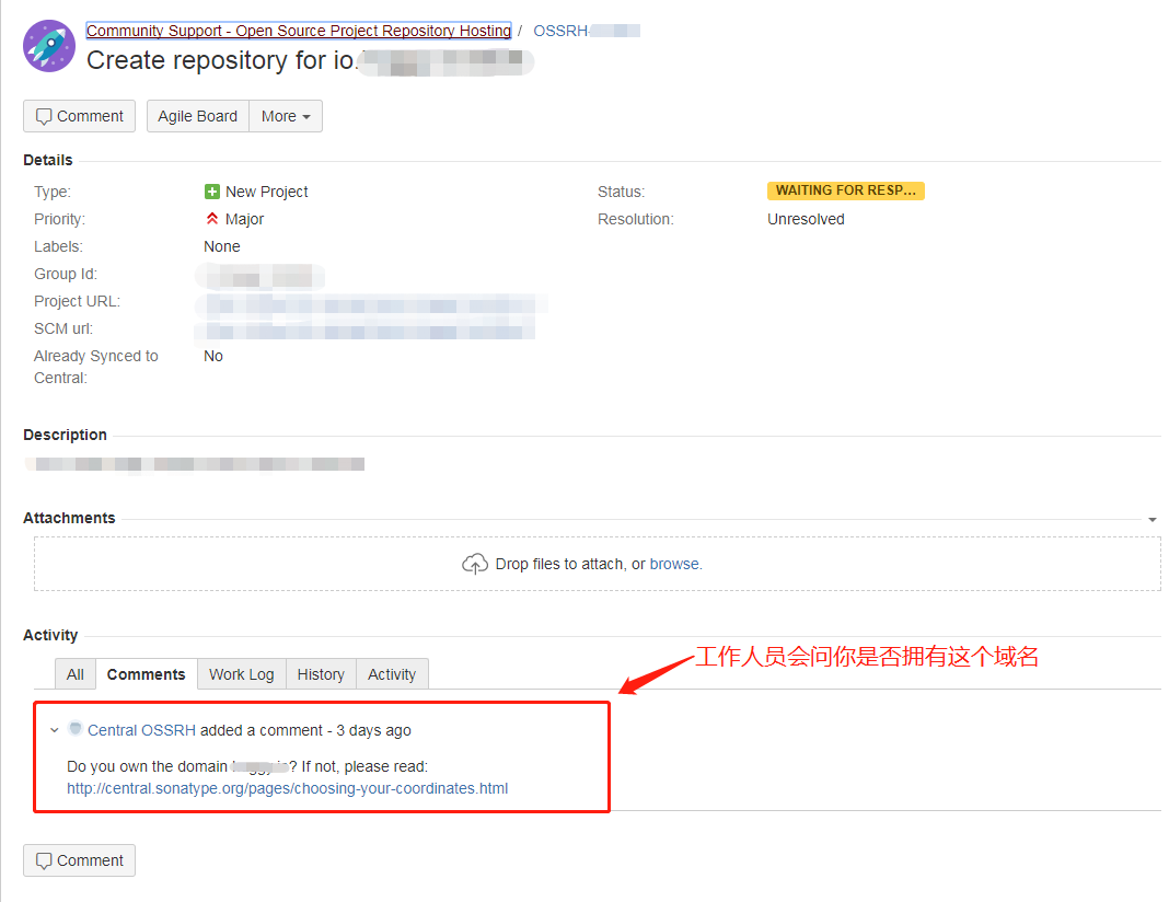 如果是用com.github.xxx的 Group Id,就回复要使用com.github.xxx作为你的域名,否则有域名就回复有就好,接着等待工作人员确认(我等了一天),确认成功之后 issue 的状态就会变成RESOLVED,这个时候就有资格上传 jar 包到 maven 仓库了。