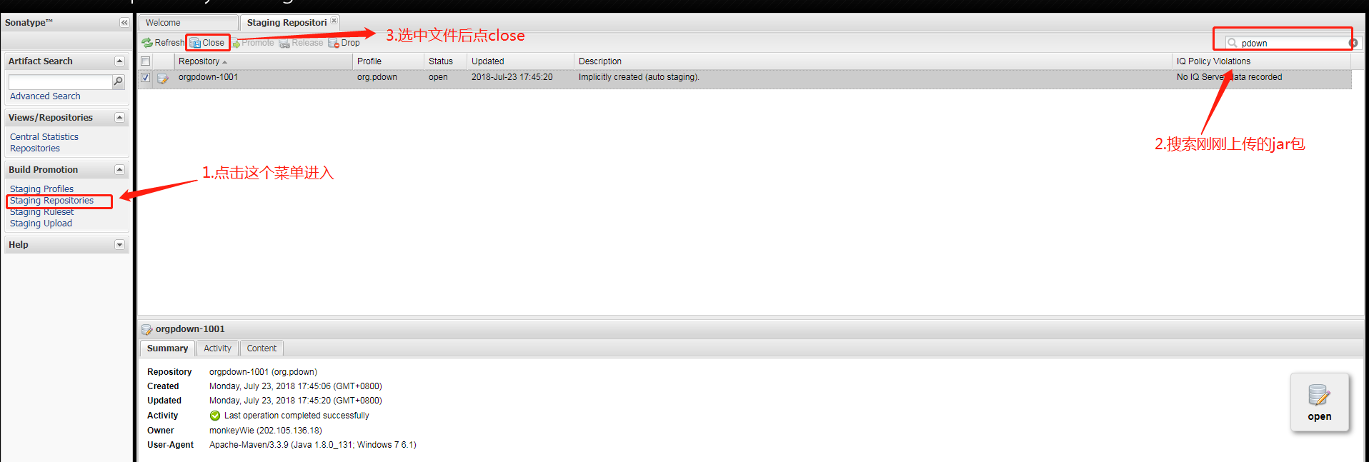 - 如果部署成功的话使用创建 issue 的帐号登录这个网址https://oss.sonatype.org/,然后看图操作。