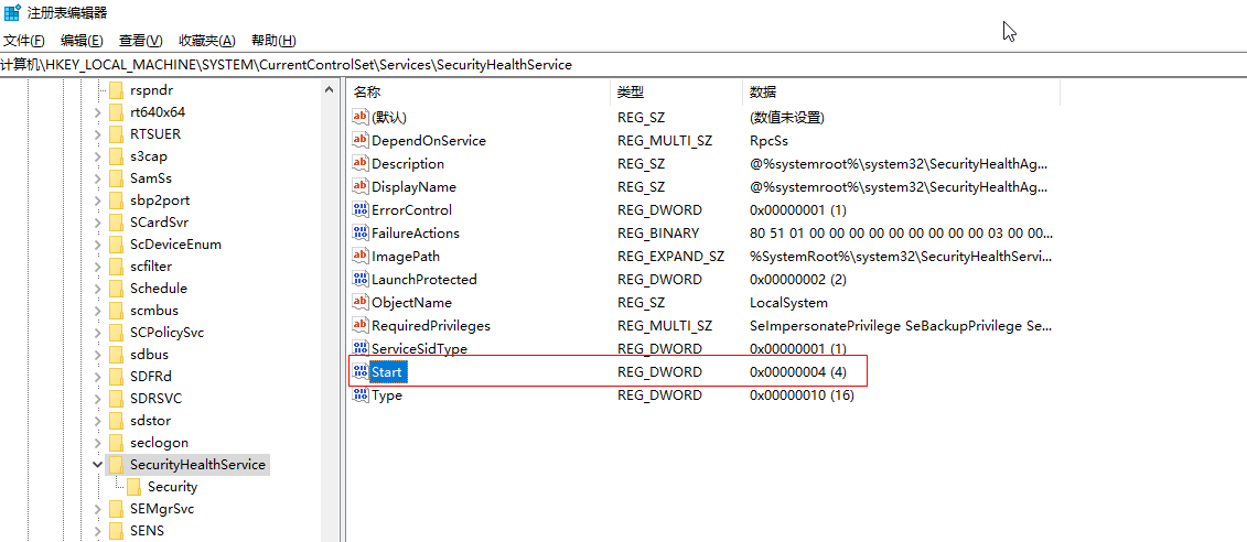 Windows Defender启动,找到\HKEY_LOCAL_MACHINE\SYSTEM\CurrentControlSet\Services\SecurityHealthService将右边窗口的