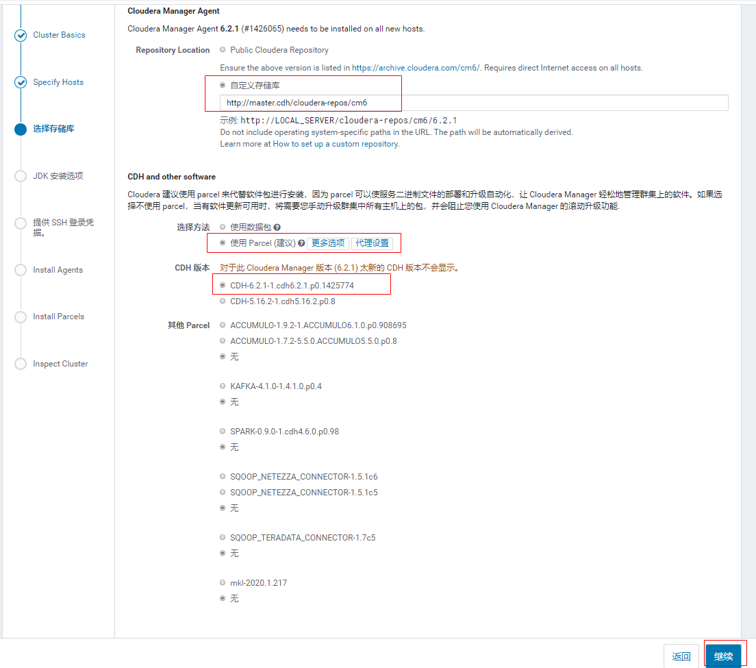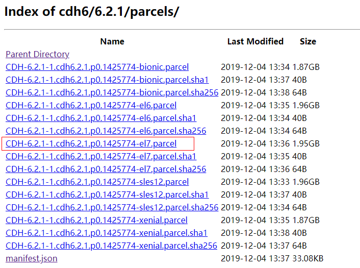 这里要注意的是,根据不同的操作系统需要下载对应的包,浏览器访问https://archive.cloudera.com/cdh6/6.2.1/parcels可以看到所有包,由于我这里用的是CentOS7,所以选择下载CDH-6.2.1-1.cdh6.2.1.p0.1425774-el7.parcel。