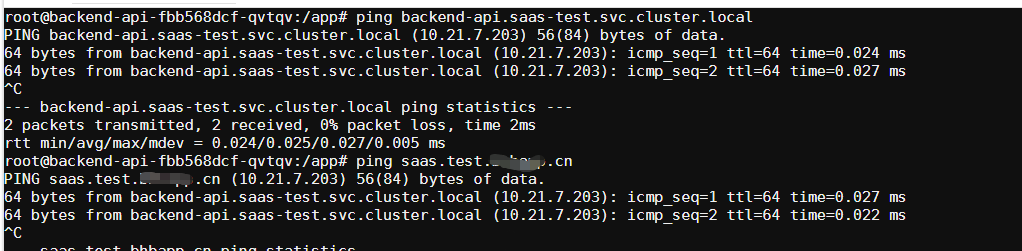 可以看到backend-api.saas-test.svc.cluster.local解析出来的 ip 是10.21.7.203,saas.test.xxx.cn解析出来的 ip 也是10.21.7.203,这样的话在集群里通过外网域名请求其实也和直接访问 service 域名一致了。