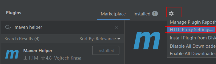 首先进入 IDEA plugins 市场,搜索Maven Helper进行安装:
