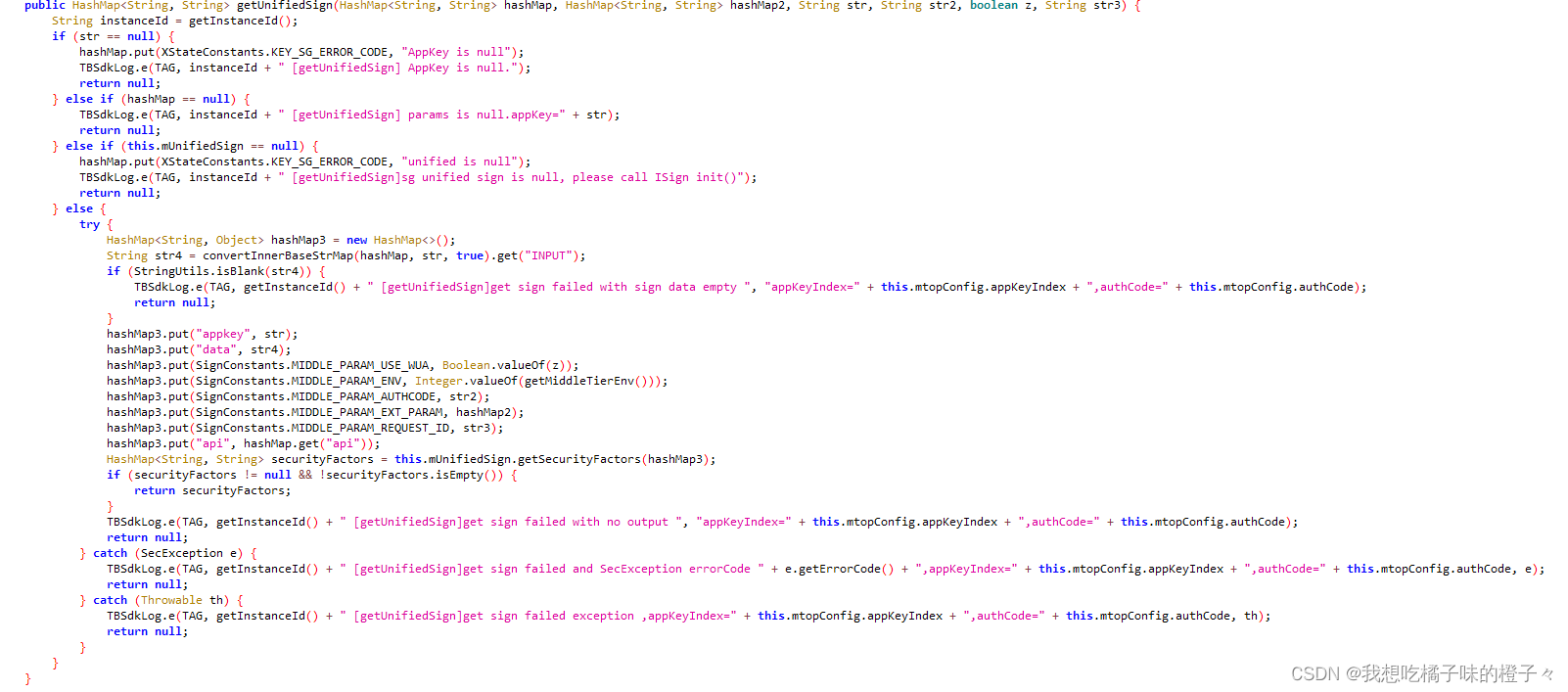 我们很容易就找到这个 getUnifiedSign 函数,仔细分析函数发现是一个接口,那这个函数所在的类 mtopsdk.security.InnerSignImpl 就是我们要找的实现类。