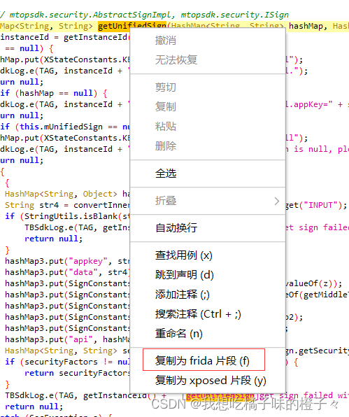 这里教你们一个小方法,在 jadx 里面对这个 getUnifiedSign 函数直接右击,复制 frida 代码,我们函数找的对不对,直接 hook 一下就知道了
