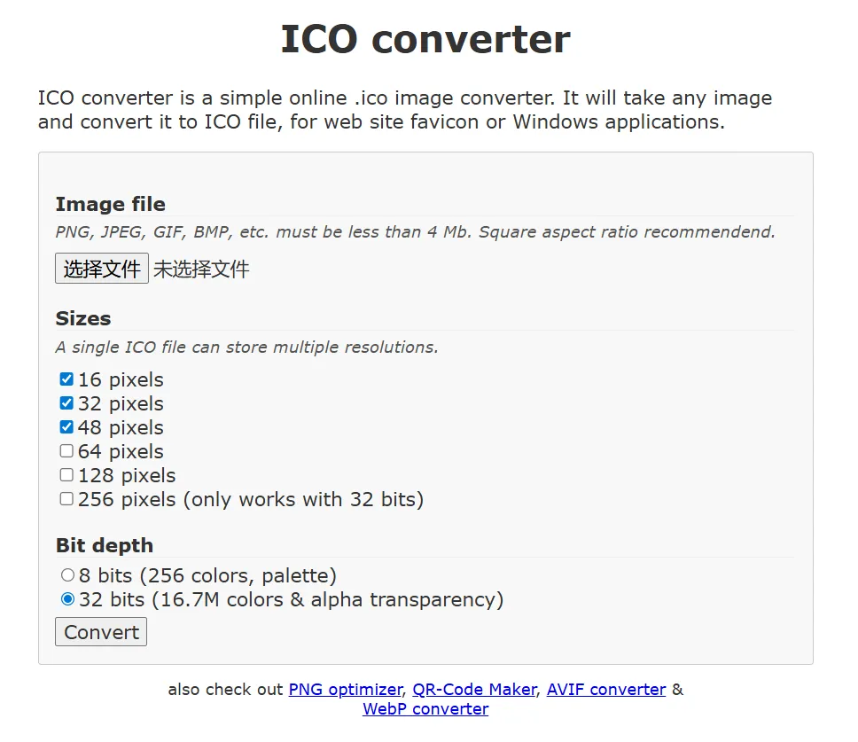 把 SVG 上传,选择需要的尺寸,就能生成包含多种分辨率的 ICO 文件。