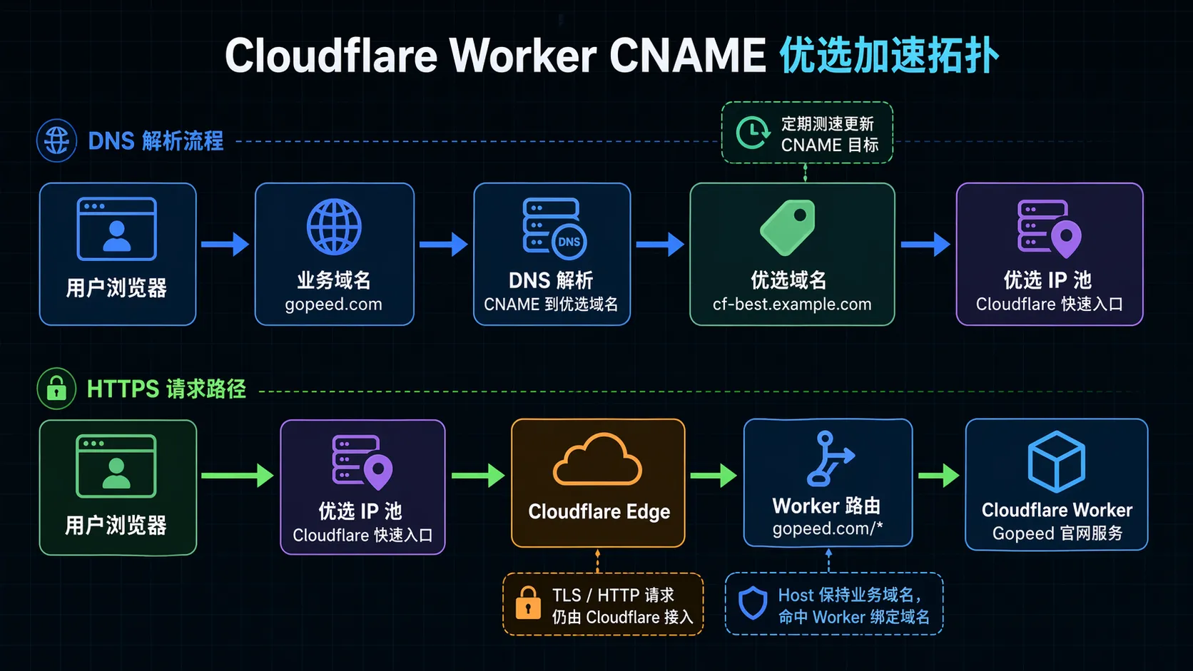整个链路大概是下面这样,业务域名通过 CNAME 指向优选域名,优选域名再解析到当前质量更好的 Cloudflare 入口 IP,最终请求仍然由 Cloudflare Edge 接入并命中 Worker 路由。