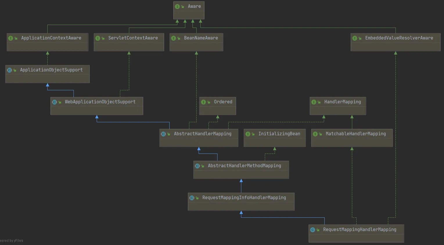 //先直接使用URI进行匹配,适用于没使用通配符修饰的接口路径,对应urlLookupList<T> directPathMatches = this.mappingRegistry.getMappingsByUrl(lookupPath);if (directPathMatches != null) { //路径匹配到之后,还要根据method、header、consume、produce等等条件继续进行匹配 addMatchingMappings(directPathMatches, matches, request);}if (matches.isEmpty()) { //如果没匹配到,再通过通配符的方式去匹配,对应mappingLookup addMatchingMappings(this.mappingRegistry.getMappings().keySet(), matches, request);}至此与 RequestMappingHandlerMapping 有关的请求流程就已经介绍完了,最后再附上一张类图: