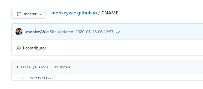 保存之后 github 会自动的在仓库根目录里生成一个CNAME文件,里面存储着域名配置信息,示例图: