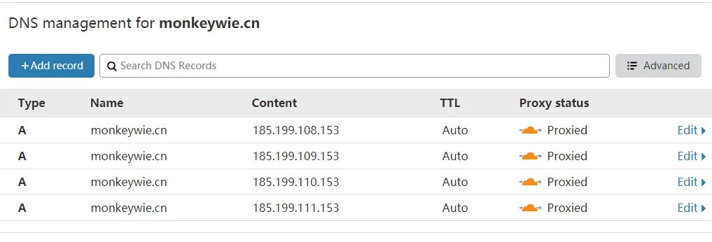 通过域名提供商,修改刚刚的域名解析,通过 A 记录分别解析到以下 4 个 IP:
