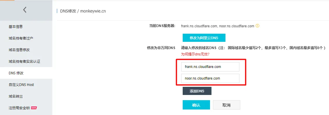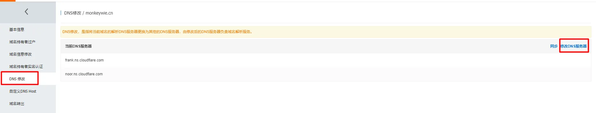 - 通过域名的运营商修改对应的 NS 记录,这里每个运营商的修改方式都不一样,我这里是用的阿里云的:
