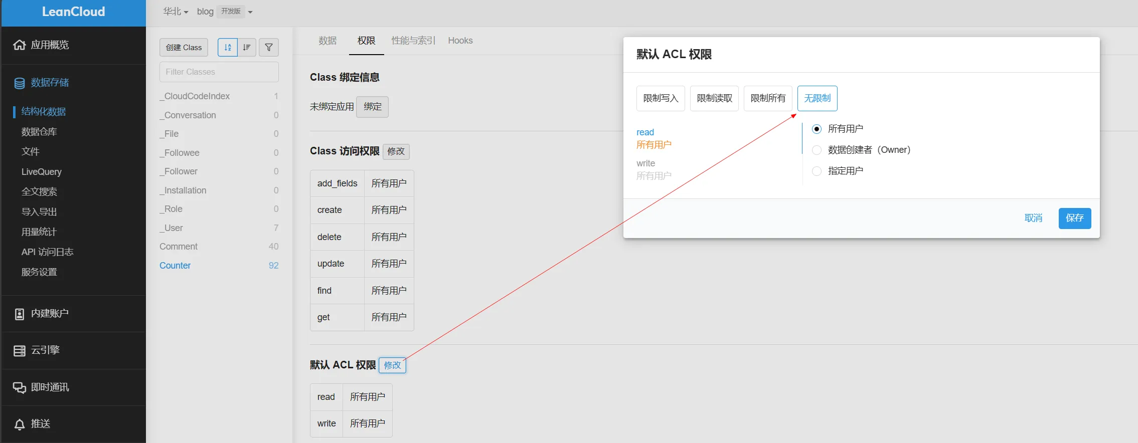 登录leancloud控制台,找到数据存储 -> 结构化数据,然后找到Counter表,点击权限,修改默认 ACL 权限为无限制: