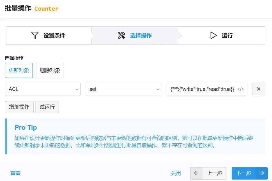 选择更新ACL为{"*":{"write":true,"read":true}},然后批量执行即可。