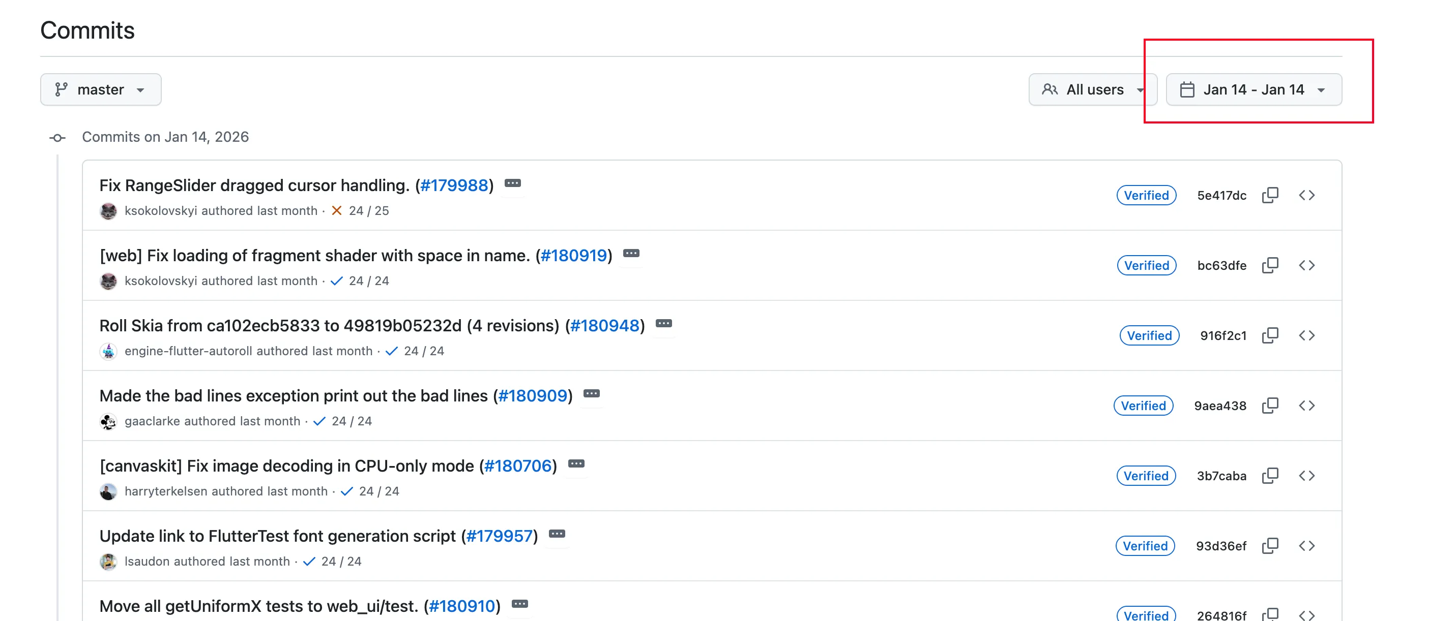 根据构建时间,就能大概推断出哪些版本的 flutter 支持 windows-arm64。比如这个是2025-01-14构建的,就在 master 分支上找这个时间点附近的 commit。可以用 GitHub 的 commit 筛选功能: