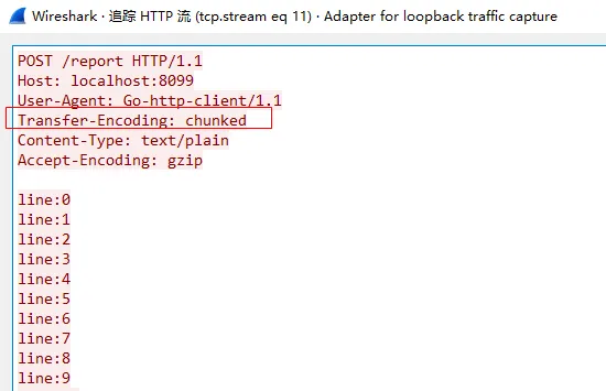 func main(){ pr, rw := io.Pipe() go func(){ for i := 0; i < 100; i++ { rw.Write([]byte(fmt.Sprintf("line:%d\r\n", i))) } rw.Close() }() http.Post("localhost:8099/report","text/pain",buf)}先运行服务端,然后运行客户端,并且使用WireShake进行抓包分析,结果如下: