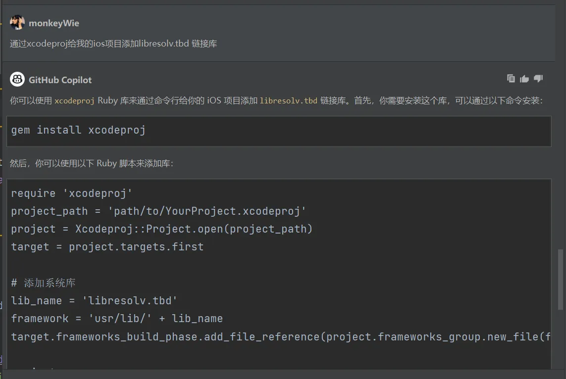他提到的解决方案是通过添加libresolv.tbd或者libresolv.9.tbd库来解决,但是很尴尬的是我没有mac设备,所以没办法在 xcode 里添加这个库,于是问了下无所不知的ChatGPT,看看能不能通过命令行添加这个库: