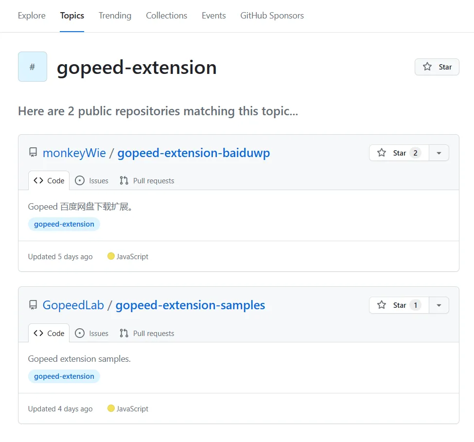 这里有人可能会问了,去中心化的扩展系统要怎么找到扩展呢?这里巧妙利用 Github Topic功能,只要给你的扩展项目仓库打上gopeed-extension的主题标签,然后通过topics/gopeed-extension就可以找到所有的扩展了: