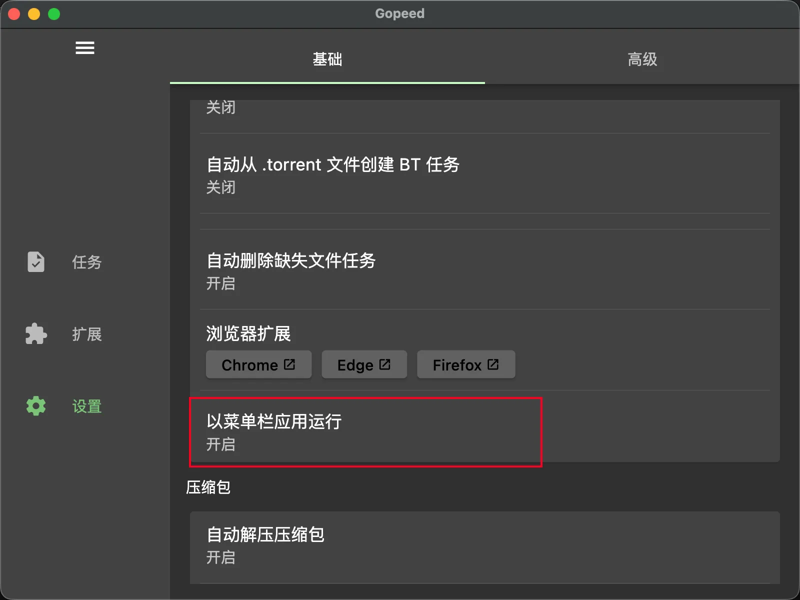 MacOS 上现在可以选择以菜单栏应用运行 Gopeed 了。开启后不会在 Dock 里显示图标,只出现在菜单栏:
