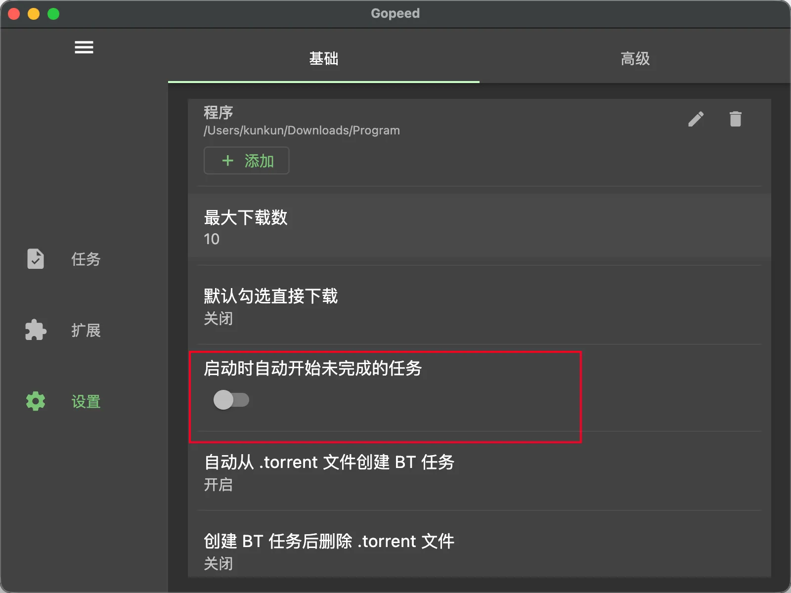 开启后每次启动应用都会自动恢复上次未完成的任务。可以在设置里配置,默认关闭: