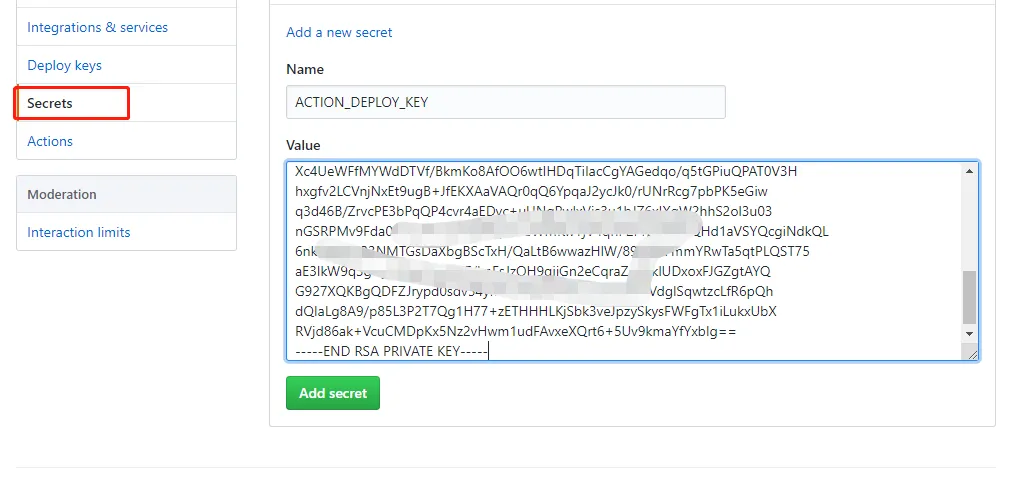 再将~/.ssh/id_rsa中的私钥添加到 Github 对应仓库的Secrets中,Name 定义为ACTION_DEPLOY_KEY,目的是在构建的时候可以读取该私钥并配添加到虚拟机中,以获取 git 仓库访问权限: