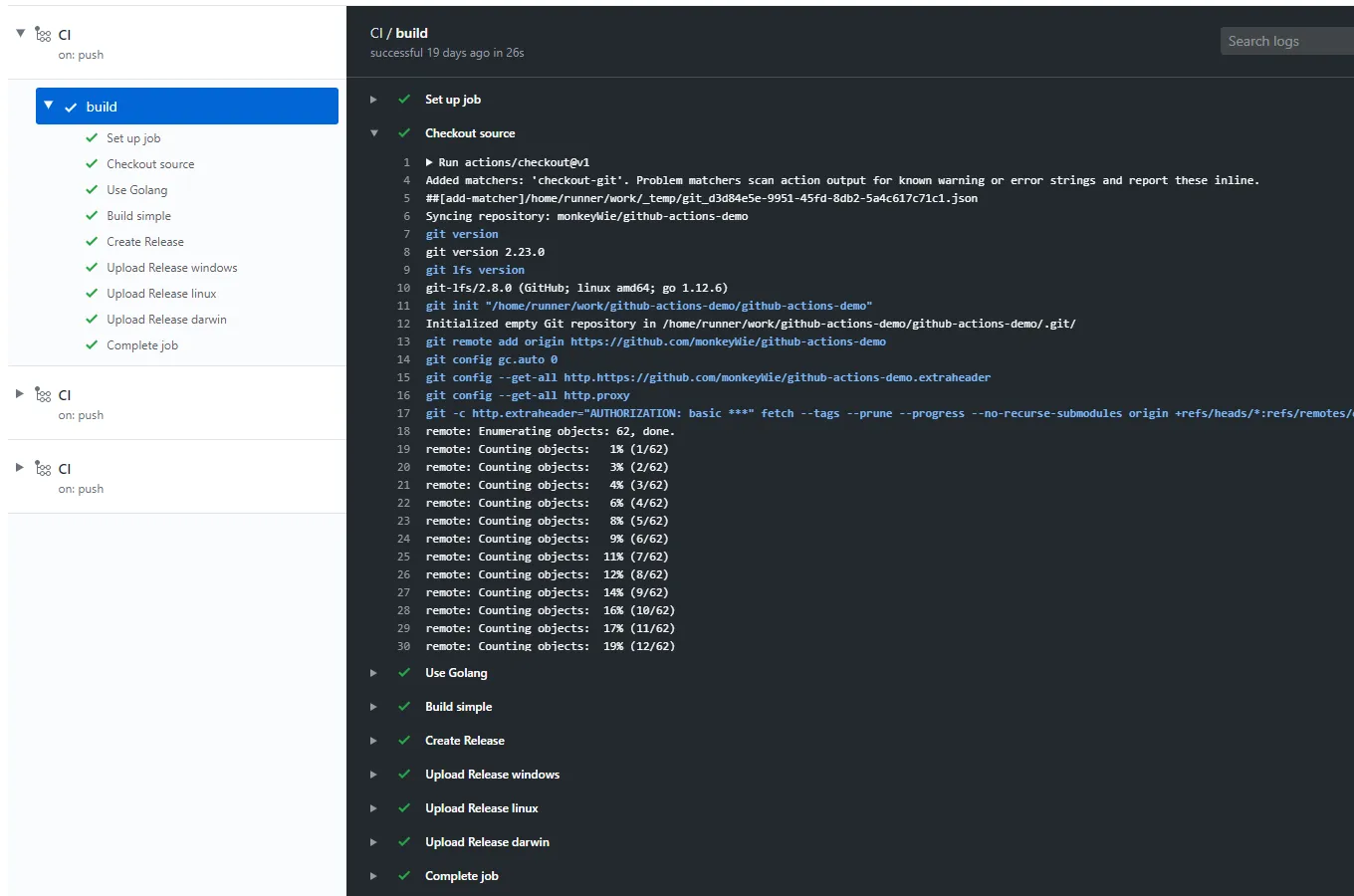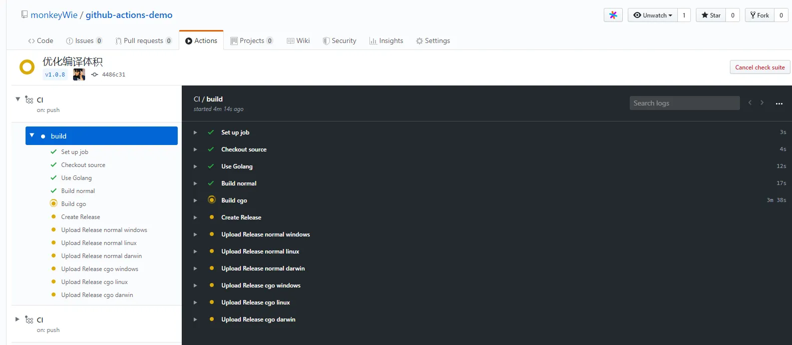 - name: Upload Release cgo windows uses: actions/upload-release-asset@v1.0.1 env: GITHUB_TOKEN: ${{ secrets.GITHUB_TOKEN }} with: upload_url: ${{ steps.create_release.outputs.upload_url }} # This pulls from the CREATE RELEASE step above, referencing it's ID to get its outputs object, which include a `upload_url`. See this blog post for more info: https://jasonet.co/posts/new-features-of-github-actions/#passing-data-to-future-steps asset_path: ./cgo-windows-x64.zip asset_name: cgo-${{ steps.create_release.outputs.tag }}-windows-x64.zip asset_content_type: application/zip - name: Upload Release cgo linux uses: actions/upload-release-asset@v1.0.1 env: GITHUB_TOKEN: ${{ secrets.GITHUB_TOKEN }} with: upload_url: ${{ steps.create_release.outputs.upload_url }} # This pulls from the CREATE RELEASE step above, referencing it's ID to get its outputs object, which include a `upload_url`. See this blog post for more info: https://jasonet.co/posts/new-features-of-github-actions/#passing-data-to-future-steps asset_path: ./cgo-linux-x64.zip asset_name: cgo-${{ steps.create_release.outputs.tag }}-linux-x64.zip asset_content_type: application/zip - name: Upload Release cgo darwin uses: actions/upload-release-asset@v1.0.1 env: GITHUB_TOKEN: ${{ secrets.GITHUB_TOKEN }} with: upload_url: ${{ steps.create_release.outputs.upload_url }} # This pulls from the CREATE RELEASE step above, referencing it's ID to get its outputs object, which include a `upload_url`. See this blog post for more info: https://jasonet.co/posts/new-features-of-github-actions/#passing-data-to-future-steps asset_path: ./cgo-darwin-x64.zip asset_name: cgo-${{ steps.create_release.outputs.tag }}-darwin-x64.zip asset_content_type: application/zip构建流程如下: