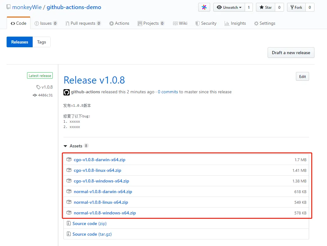 fork了一份create-release代码,就是把tag name给输出来了,这里是相关的PR,还没被合并,所以上面的创建 Release 的 action 是用的我自己的仓库monkeyWie/create-release@master,还有关于 go 交叉编译的知识,有兴趣可以看看我的这篇博客:go-cross-compile。