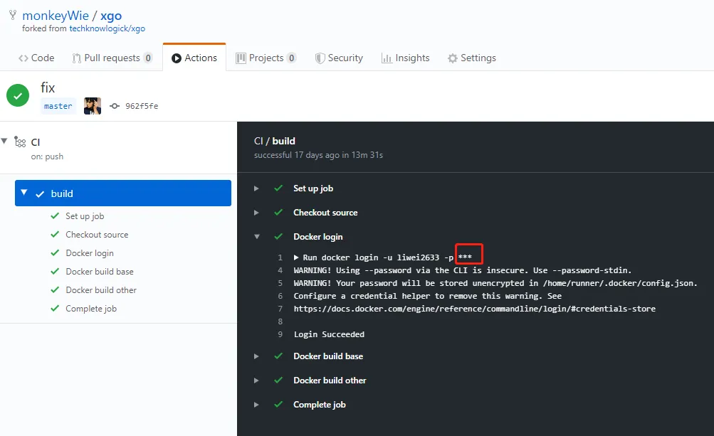 ${{ secrets.DOCKER_HUB_PWD }},这里不用担心控制台输出会暴露密码,通过secrets访问的变量在控制台输出时都会打上马赛克