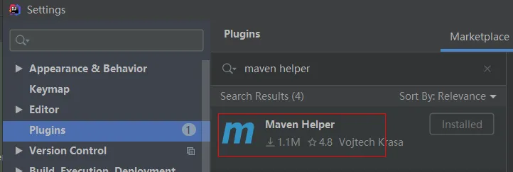 首先进入 IDEA plugins 市场,搜索Maven Helper进行安装: