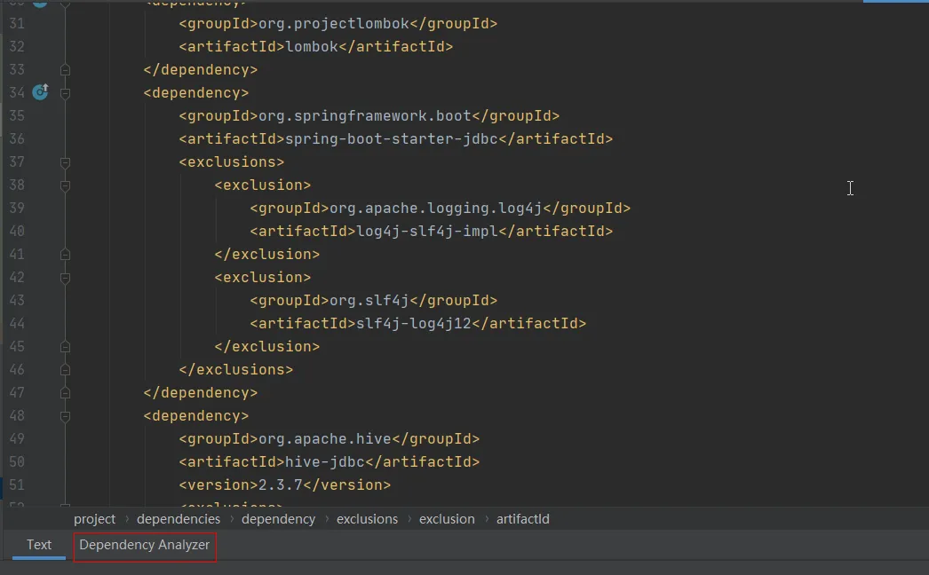 点击Exclude之后,插件自动会在pom.xml文件中添加<exclusion>相关代码,进行子依赖的排除。