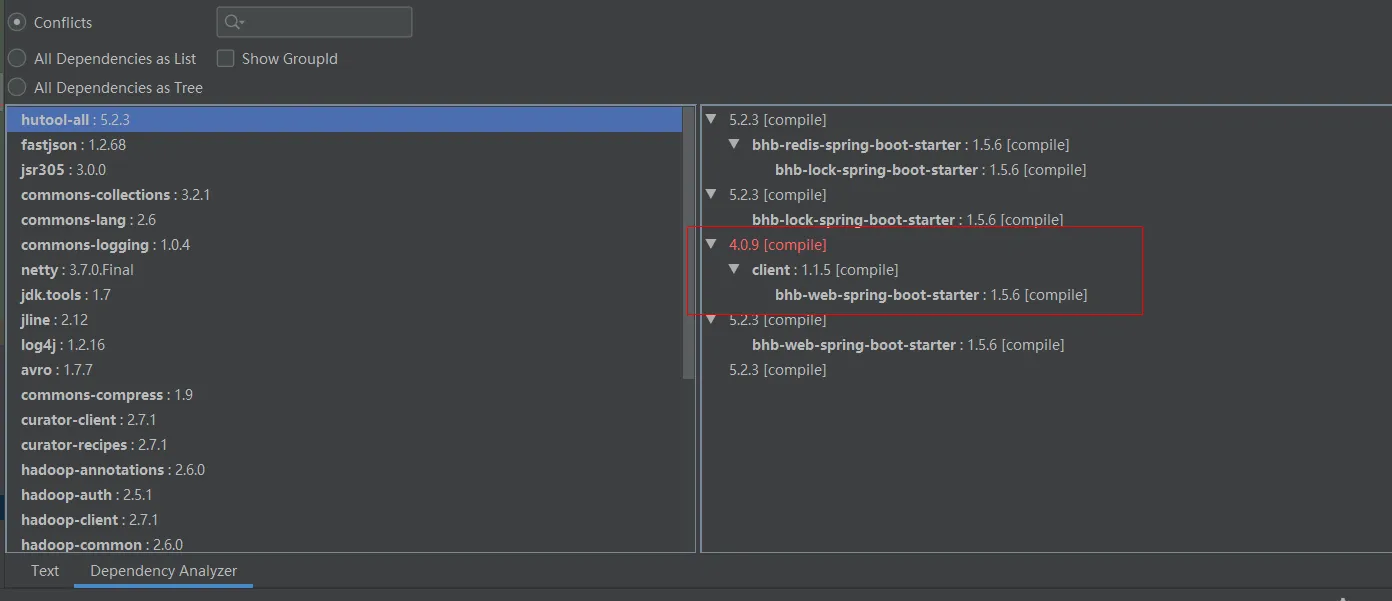 选中Conflicts插件就会列出有冲突的依赖,然后选择某个依赖就可以看到详细信息: